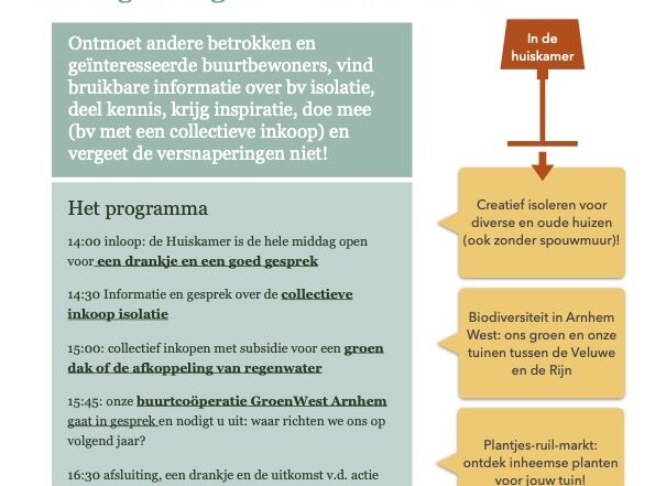 Werkochtend coöperatie GroenWest Arnhem 25 oktober, 9:30 – 13:00 uur, inloop met koffie vanaf 9:00 uur Bestuurskamer Hulkesteinflat, Utrechtseweg 145, Arnhem Coöperatie GroenWest Arnhem groeit. Denk of doe mee, word lid! Samen aan de [...]